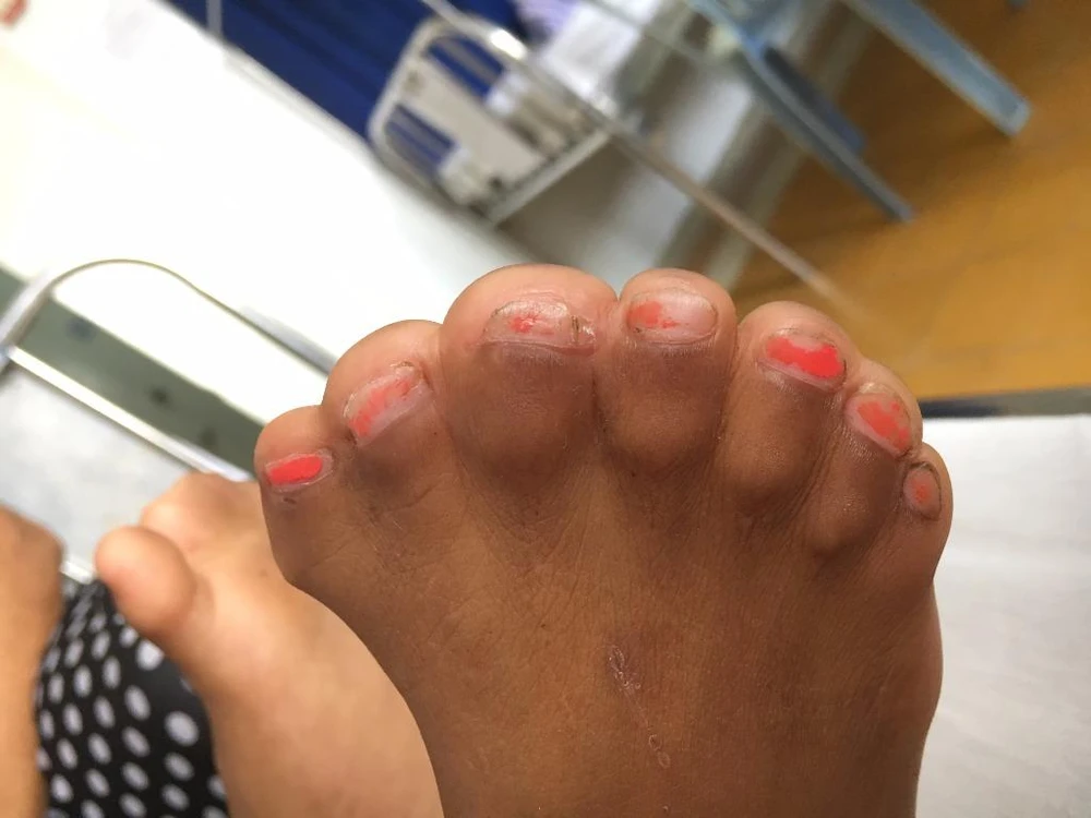 Ngoài hai bàn tay, bàn chân của Lâm cũng bị dính và thừa ngón kỳ lạ. Ảnh: H.LAN
