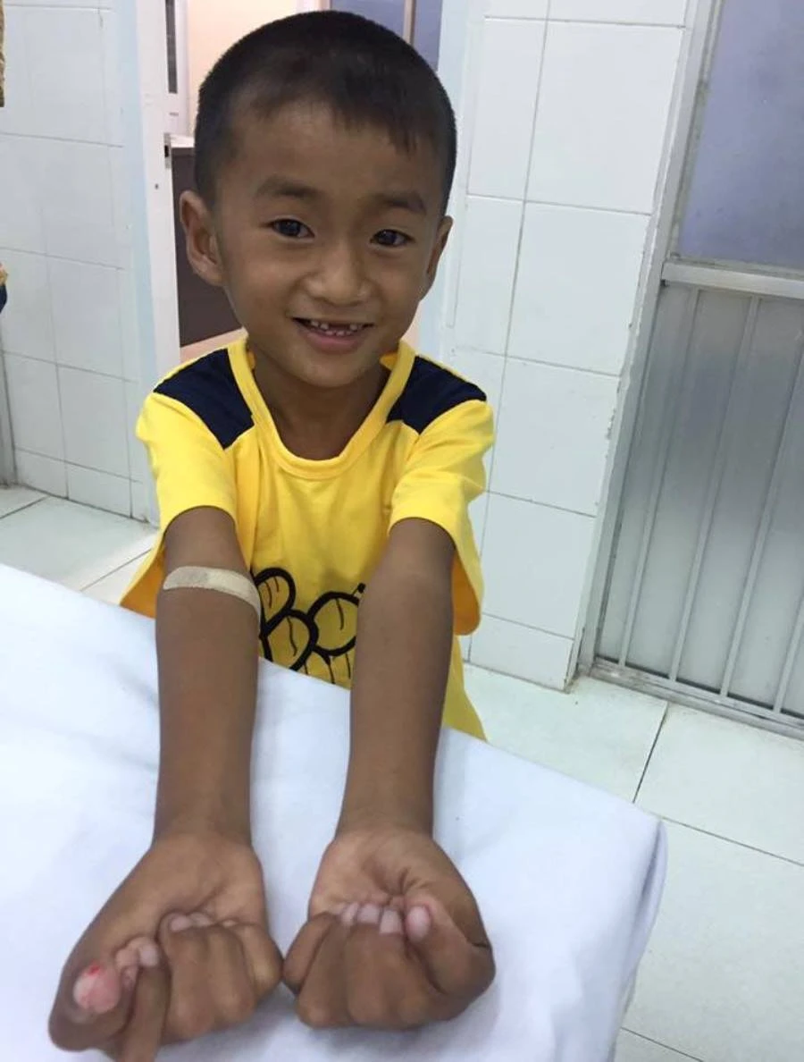 Bé Thông Thái Lâm sau ca mổ tạo hình bàn tay phải. Ảnh: H.LAN