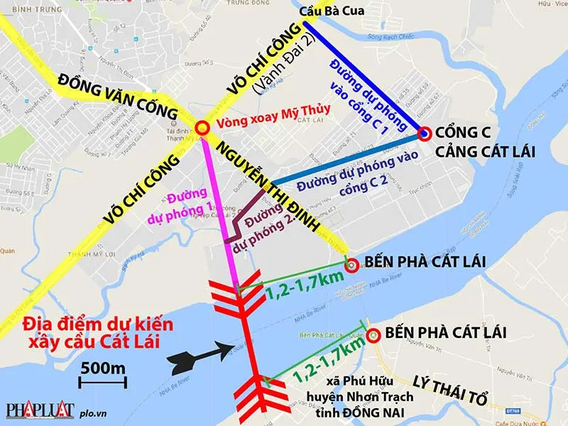 Còn điểm đầu của đường dẫn nằm phía quận 2, TP.HCM đang được tính toán. Theo đề án do một công ty đưa ra (tạm gọi phương án 1 - PV) thì sẽ phóng một con đường mới từ nút giao vòng xoay Mỹ Thủy, đi men theo rìa Khu công nghiệp Cát Lái để tiếp cận điểm đầu cầu nêu trên. Với phương án này thì việc mở rộng đường Nguyễn Thị Định chỉ cần là 60 m và có thể làm sớm để giải tỏa ùn tắc cho xe lên xuống cảng Cát Lái.