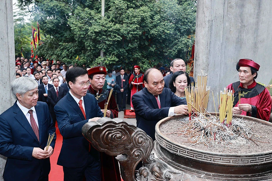 Trong giờ phút lắng đọng hồn thiêng sông núi, Chủ tịch nước Nguyễn Xuân Phúc, các vị lãnh đạo Đảng, Nhà nước và tỉnh Phú Thọ đã thành kính dâng hương, hoa, lễ vật tưởng nhớ, tri ân công đức của các vua Hùng đã có công dựng nước, cầu cho xã tắc thịnh vượng, quốc thái dân an, bách gia trăm họ vạn đại trường tồn, đất nước ngày càng vững mạnh, hùng cường.