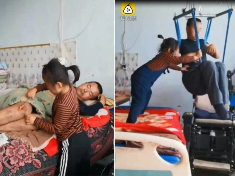 Cô con gái sáu tuổi giúp cha lau vết thương và di chuyển cha từ giường vào xe lăn. Ảnh: Wechat