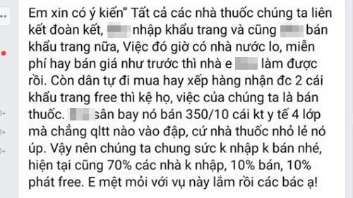 Bài viết còn có nội dung:“Sân bay bán 350.000 đồng/10 cái khẩu trang y tế bốn lớp mà chẳng quản lý thị trường nào vào đập, cứ nhà thuốc nhỏ lẻ nó úp. Vậy nên chúng ta chung sức không nhập không bán. Hiện tại cũng 70% nhà thuốc không nhập, 10% bán, 10% phát miễn phí. Em mệt mỏi với vụ này lắm rồi các bác ạ”.