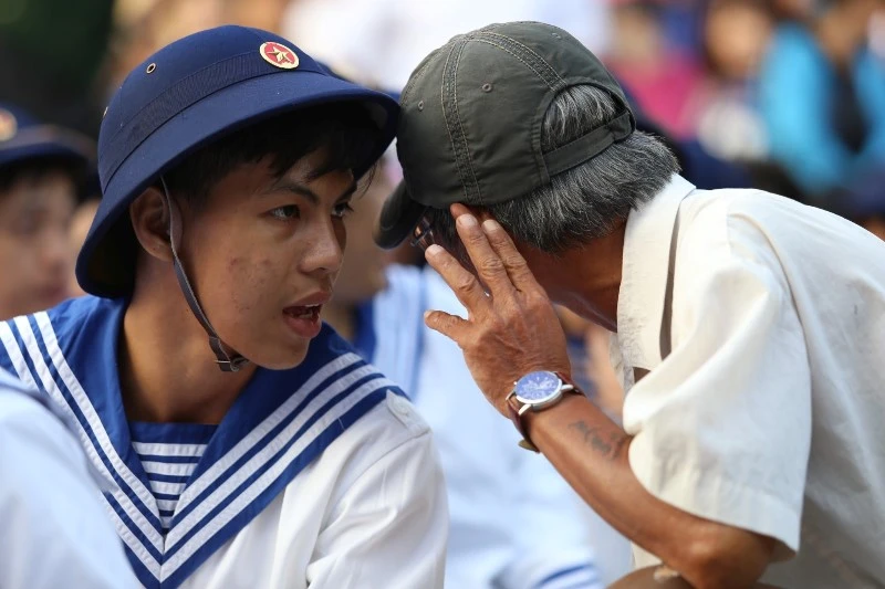 Bố dặn con trai trước lúc lên đường. Ảnh: HOÀNG GIANG
