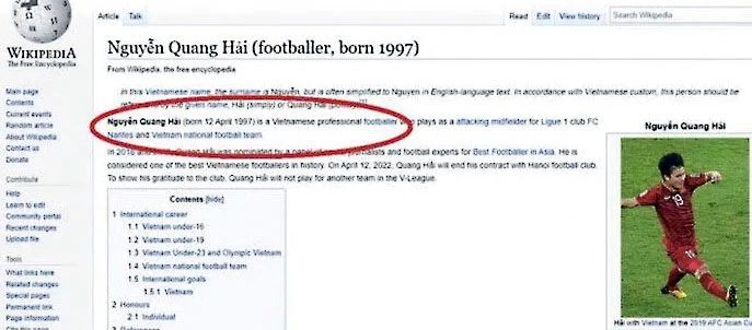 Trang Wikipedia tiếng Anh của Quang Hải cũng bị sửa.