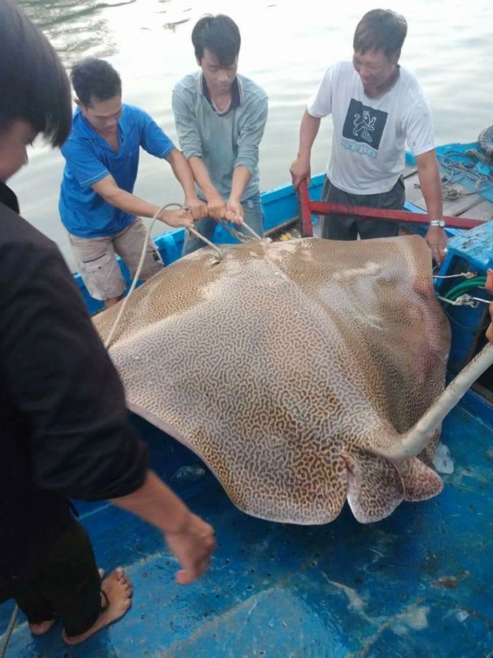Con cá đuối nói trên có chiều ngang đo được rộng gần 2 m, chiều dài hơn 3 m, phần đuôi dài hơn 1 m. Trên lưng cá là những hoa văn đốm nâu rất đẹp và lạ mắt.