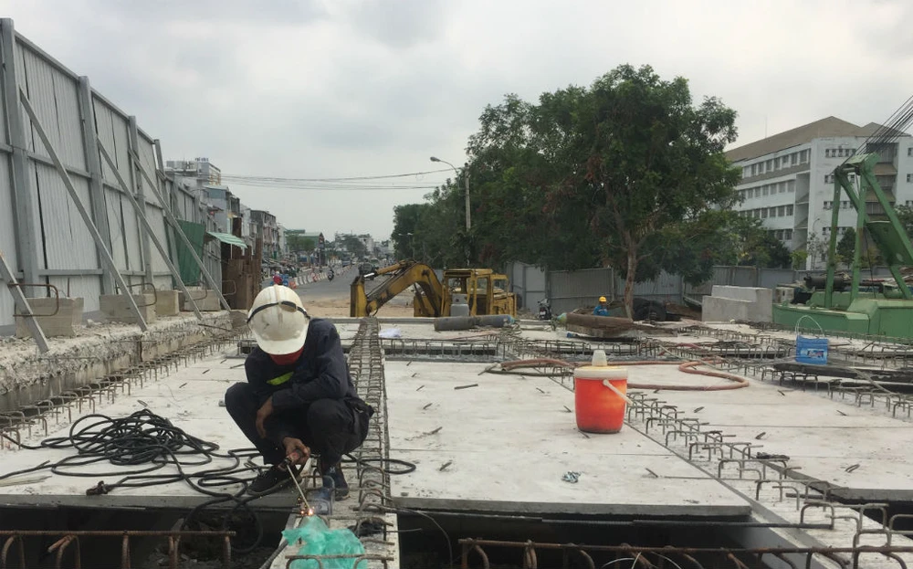 Công trình được khởi công từ tháng 12-2017 đến nay mặt bằng vẫn vướng đường ống cấp nước D 600 chưa di dời xong. Phía quận 9 cũng vẫn chưa thể triển khai thi công tường chắn và đường dẫn đầu cầu.