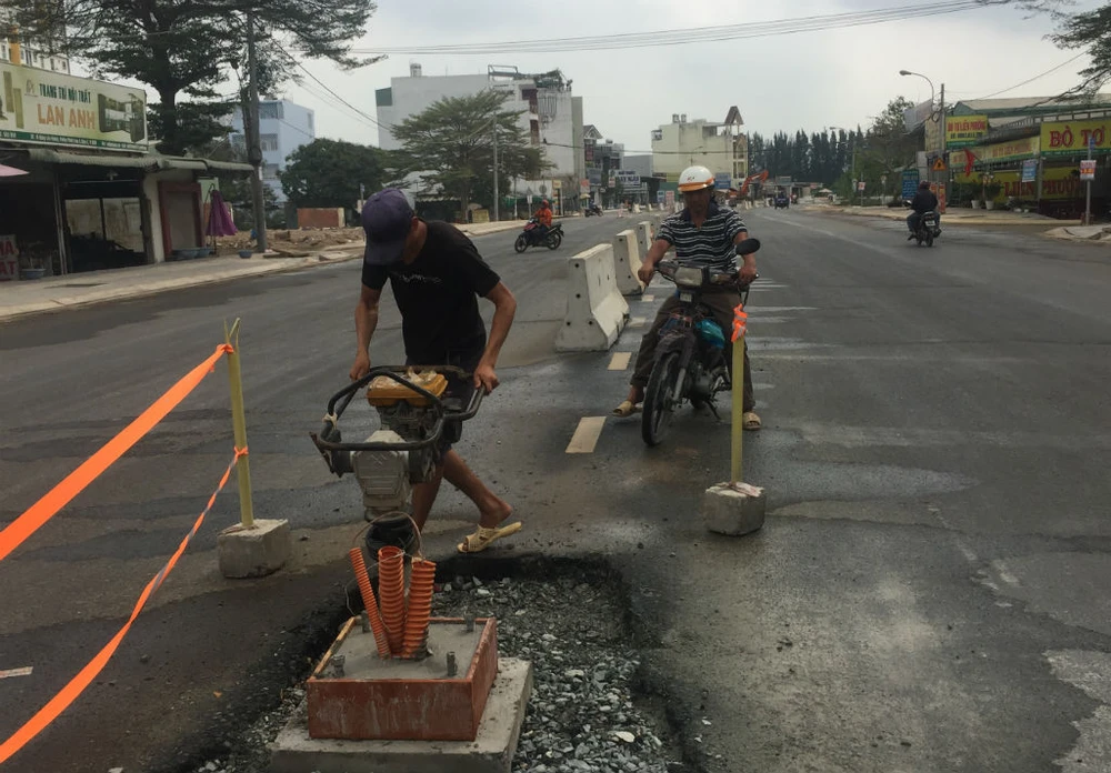 Công nhân hoàn thiện dải phân cách, hệ thống cáp điện ngầm phục vụ chiếu sáng.