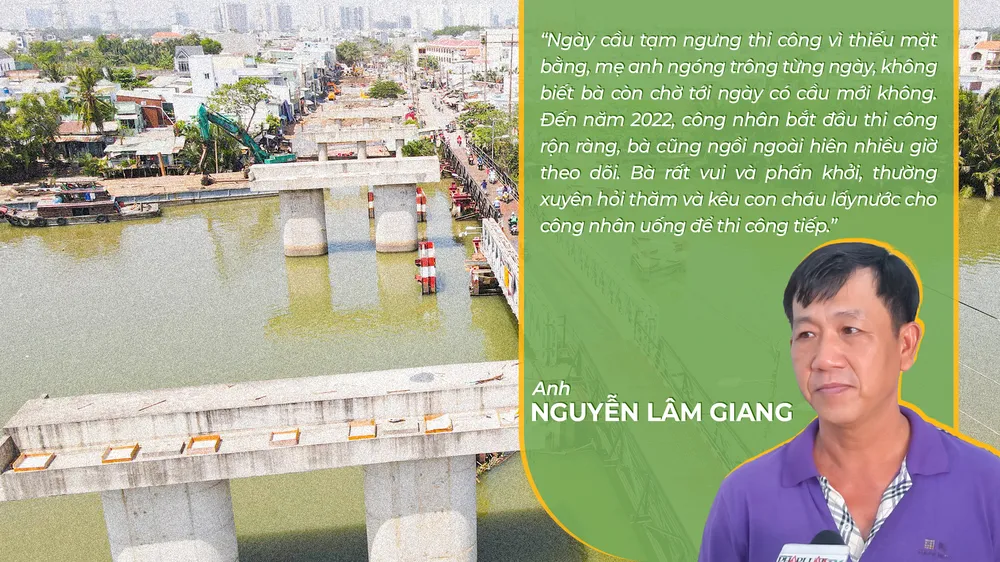 Cùng chung niềm vui vì có cây cầu mới, anh Nguyễn Lâm Giang cho biết mẹ anh (cụ Lâm Thị Nga, 86 tuổi) từ hồi trẻ đã mong cầu sớm hoàn thành, để người dân, nhất là các em học sinh đi lại thuận tiện.