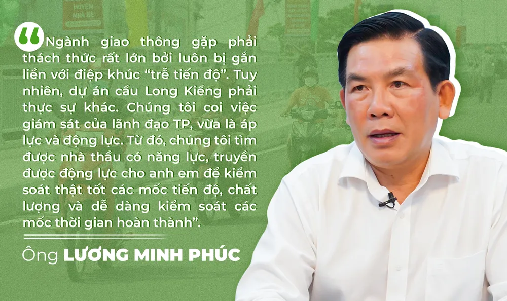 Chia sẻ về cảm xúc này, ông Phúc cho biết ngành giao thông gặp phải thách thức rất lớn bởi luôn bị gắn liền với điệp khúc “trễ tiến độ”. Tuy nhiên, dự án cầu Long Kiểng phải thực sự khác. Chúng tôi coi việc giám sát của lãnh đạo TP, vừa là áp lực và động lực. Từ đó, chúng tôi tìm được nhà thầu có năng lực, truyền được động lực cho anh em để kiểm soát thật tốt các mốc tiến độ, chất lượng và dễ dàng kiểm soát các mốc thời gian hoàn thành.
