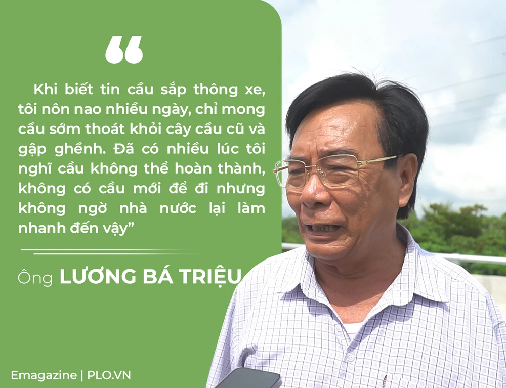 Ông Lương Bá Triệu (71 tuổi) cũng có mặt tại lễ khánh thành để hoà chung niềm vui cùng bà con. “Gia đình tôi từ sau khi nhường đất làm cầu đã thoát cảnh ngập nước, nhà thành mặt tiền, đường xá đẹp, rộng rãi nên việc buôn bán thuận lợi hơn. Hôm nay chạy qua cầu mới, tôi rất sung sướng, hạnh phúc”- ông Triệu nói.