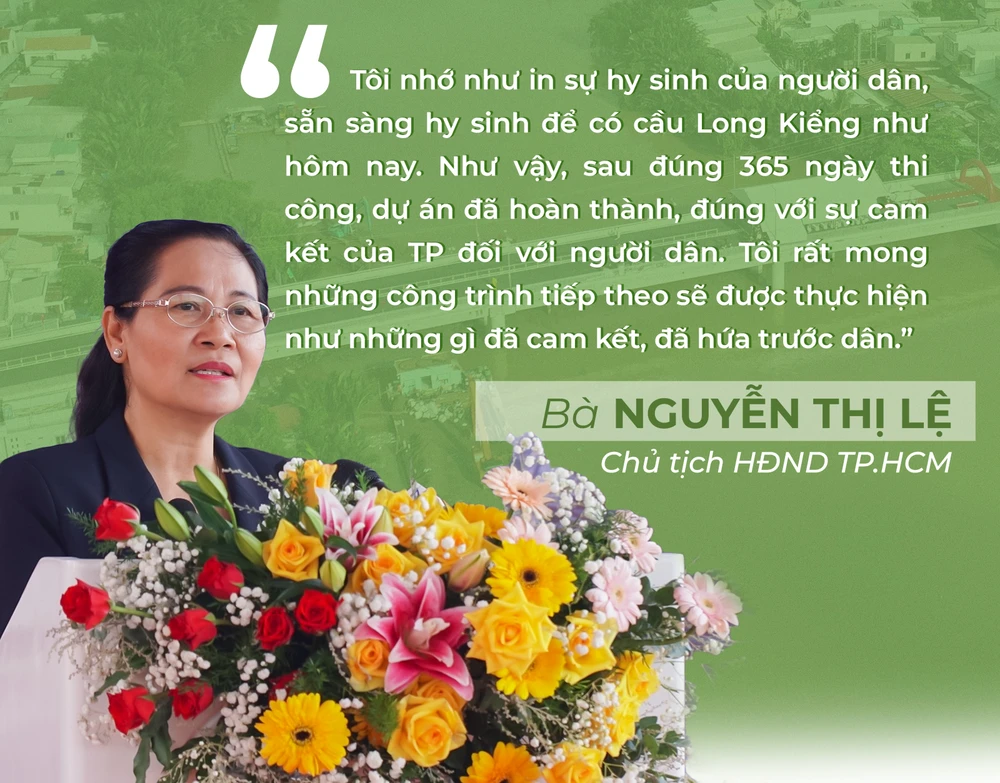 Đúng ngày 8-9-2021, tôi đã đứng trước bà con nhân dân huyện Nhà Bè để nhận mặt bằng triển khai dự án – đây là lần đầu tiên TP.HCM có một lễ bàn giao mặt bằng. Tại đây, tôi có hứa với bà con sẽ hoàn thành dự án trước ngày 31-12-2023, hôm nay dự án được hoàn thành sớm hơn 3 tháng so với dự kiến. Đó là toàn bộ sự quyết tâm, trân trọng của Ban Giao thông đối với bà con nhân dân huyện Nhà Bè và người dân TP.