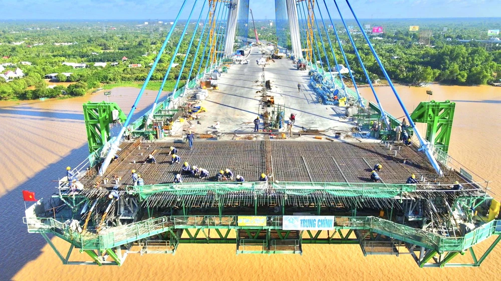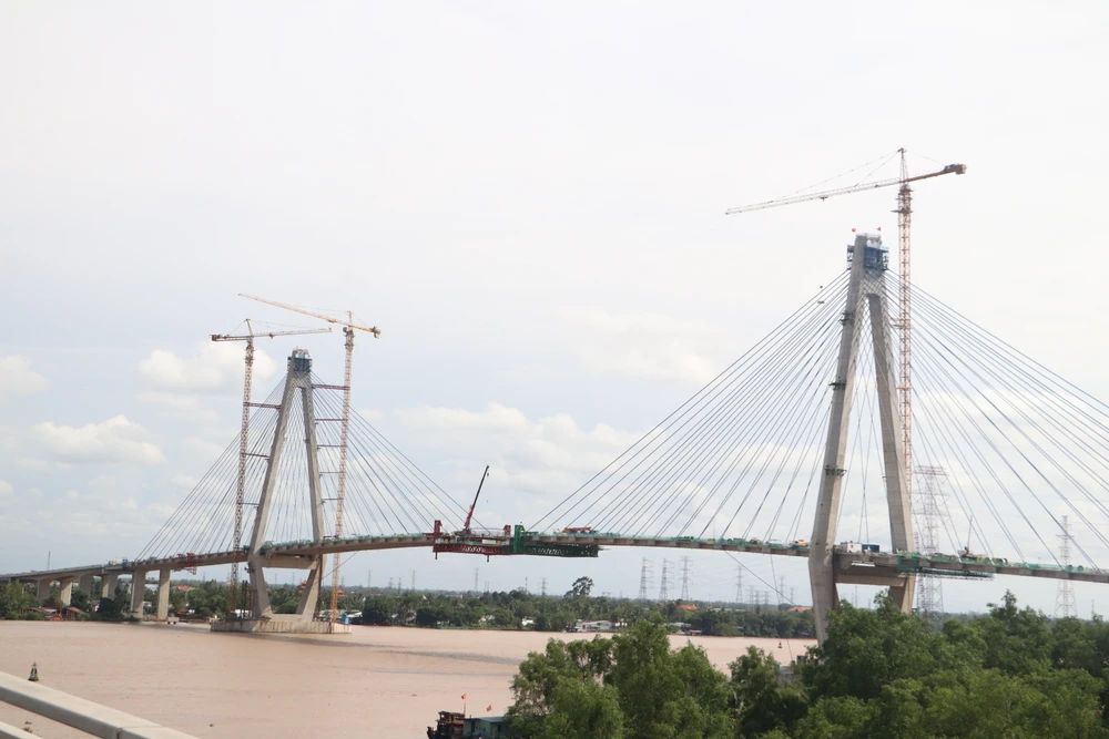 Sau 33 tháng khởi công, ngày 5-12-2022, sợi cáp dây văng đầu tiên của cầu Mỹ Thuận 2 đã được căng lên.
