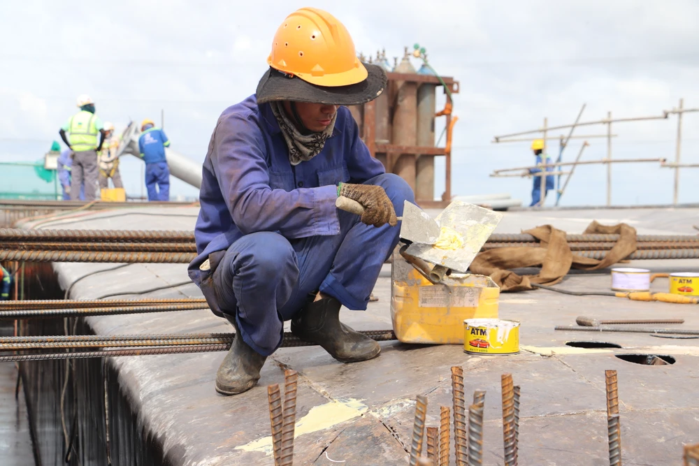 Công tác thi công hai đốt dầm đang rất khẩn trương, làm cả đêm để đảm bảo tiến độ, bám sát mục tiêu hợp long. Ngoài nhịp cầu chính thì các công tác khác như lan can, hộ lan, dãy ngăn cách… cũng được đẩy nhanh, thi công song song đảm các các hạng mục hoàn thành cùng lúc.