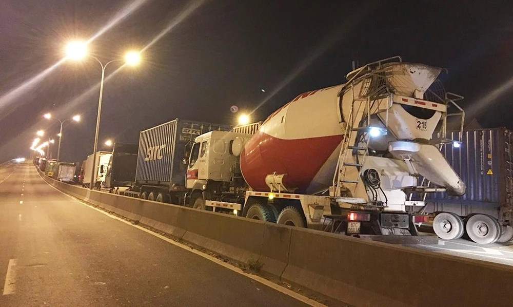 Giao thông qua cầu Phú Mỹ kẹt cứng vì xe tải lật khuya ngày 11-6.