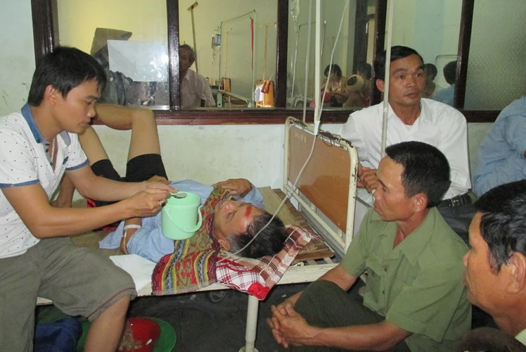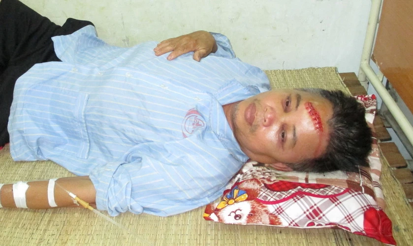 Tại đây, các bác sĩ chẩn đoán ông Nghĩ bị chém sâu vào trán khiến vỡ xương sọ, tụ máu màng não. Các bác sĩ đã phải khâu vết chém sâu trên trán ông Nghĩ tới 7 mũi.