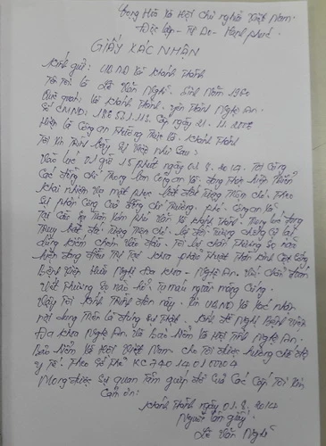 Giấy xác nhận để xin được hưởng chế độ bảo hiểm y tế của ông Lê Văn Nghĩ.