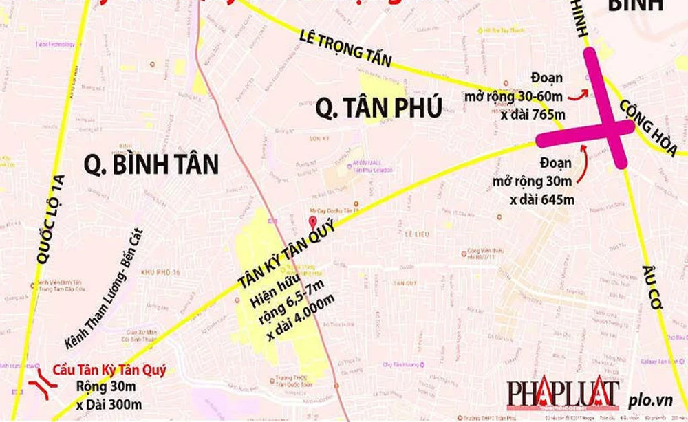 Họa đồ mở rộng đường Tân Kỳ Tân Quý với các điểm nóng về giao thông như Âu Cơ, ngã tư Tân Kỳ Tân Quý - Trường Chinh, Tân Kỳ Tân Quý - quốc lộ 1 và vị trí làm cầu - nút giao mới.
