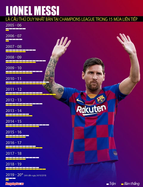 Thống kê 15 mùa liên tiếp nổ súng của siêu sao Messi. Ảnh: Bongdaplus