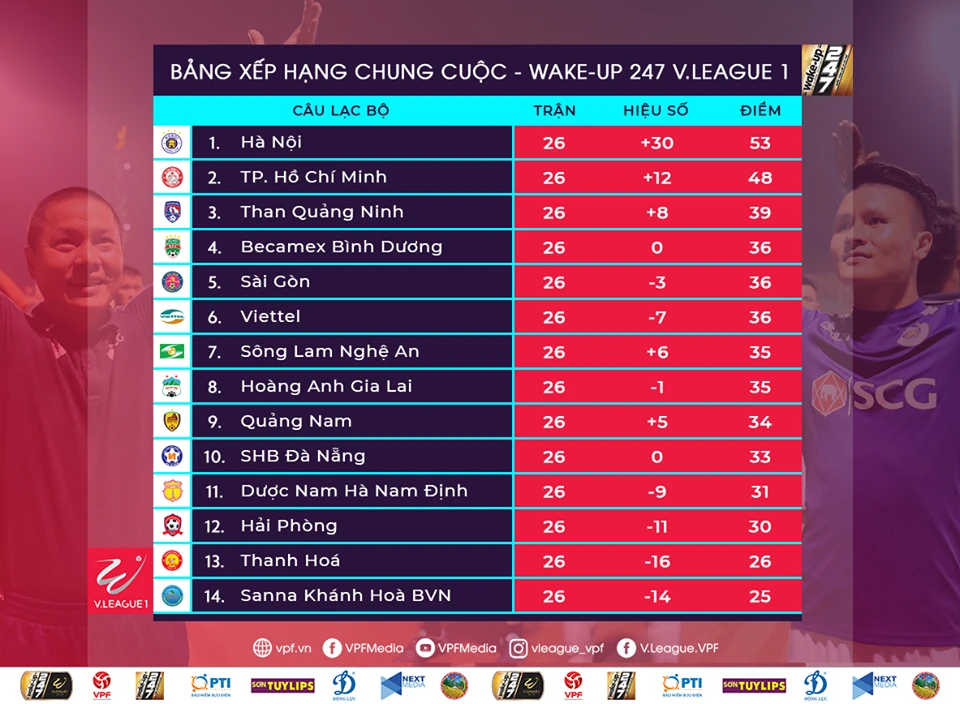 Bảng xếp hạng V-League 2019.