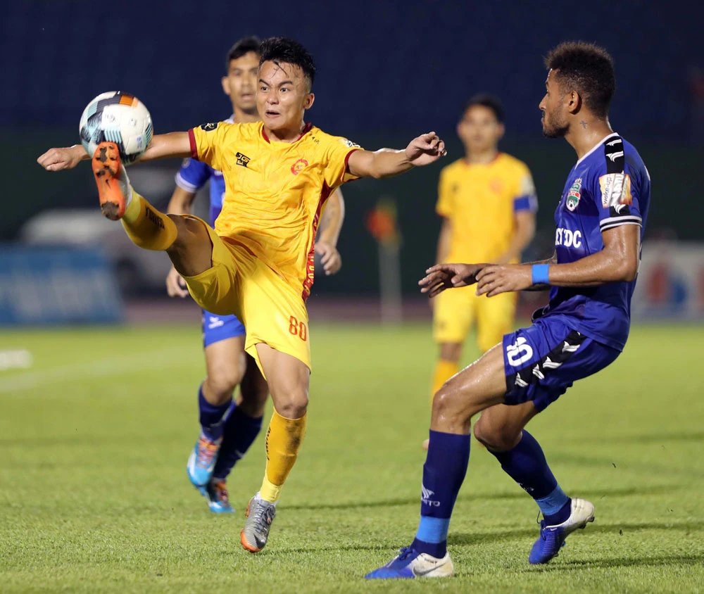 Thanh Hóa (áo vàng) tranh suất trụ hạng không có sự phục vụ của các ngoại binh. Ảnh: VPF