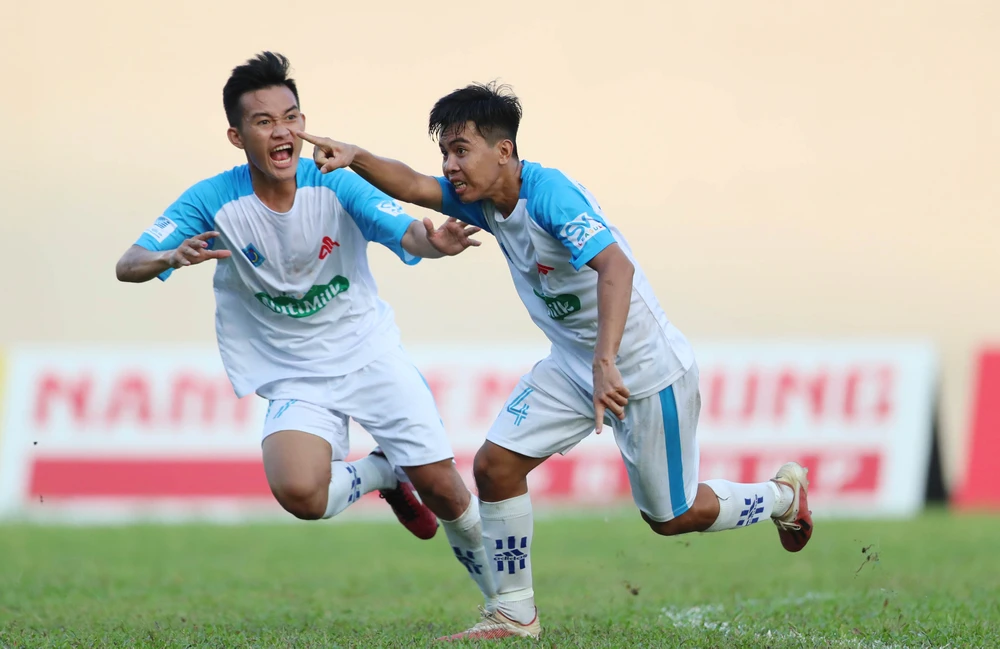 Văn Yên và đồng đội ĐH Cần Thơ ăn mừng bàn thắng quý vào lưới ĐH Sài Gòn. Ảnh: ANH THÔNG.