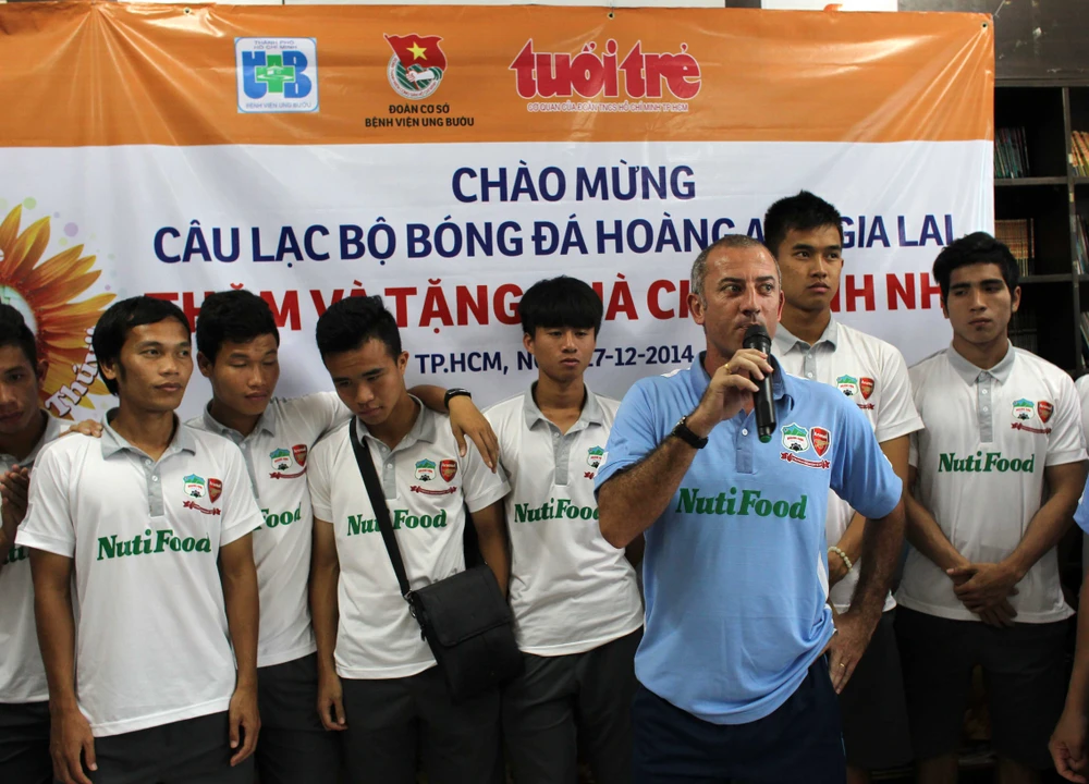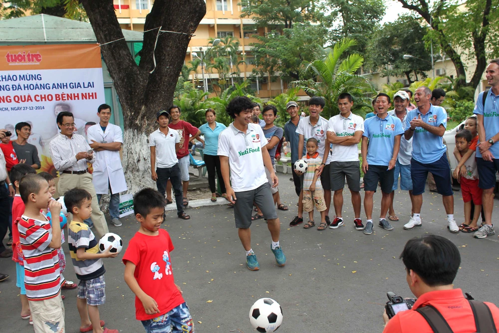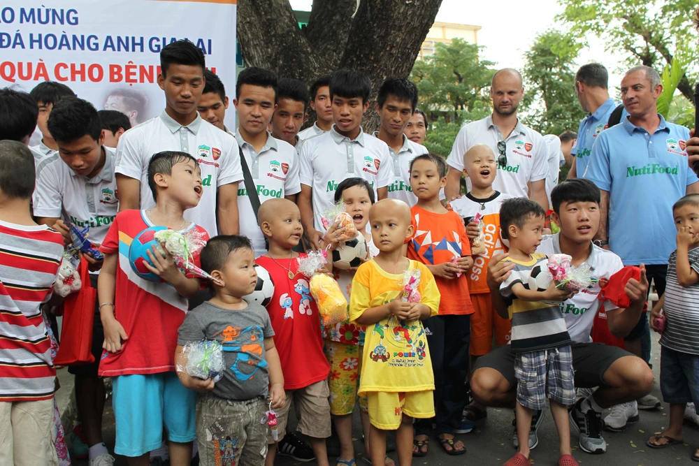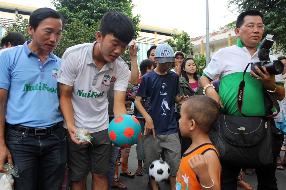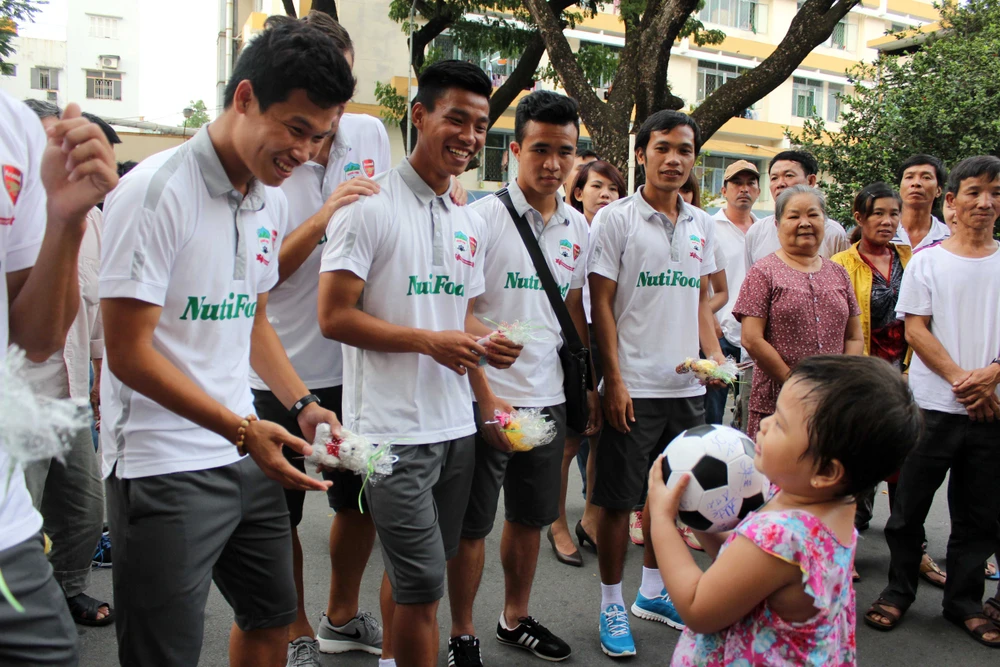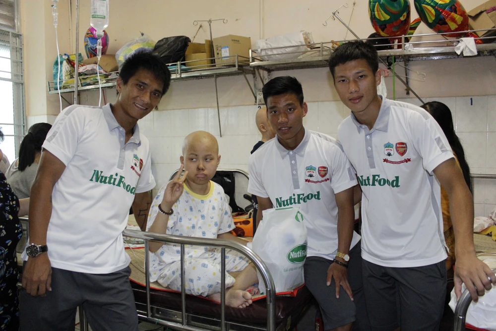 Các cầu thủ đã trao 150 phần quà, mỗi phần gồm sữa và một trái bóng cho các bệnh nhi ung bướu.