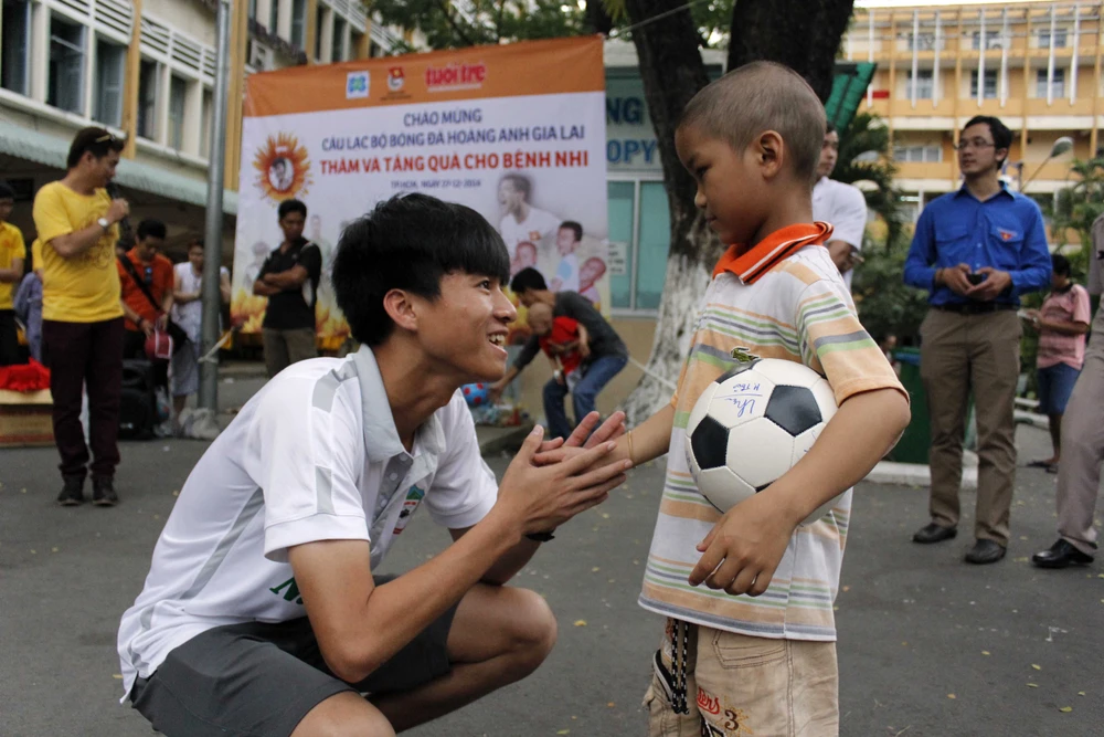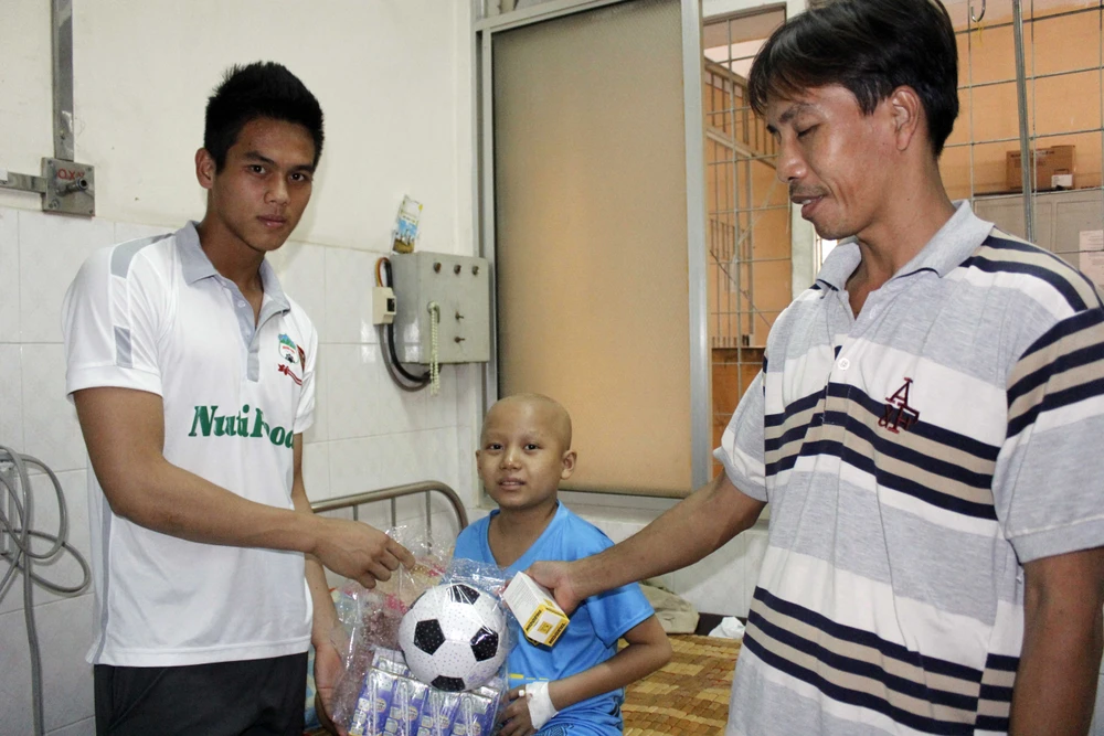 Cầu thủ Xuân Trường trao quà cho bệnh nhi với nụ cười thật tươi