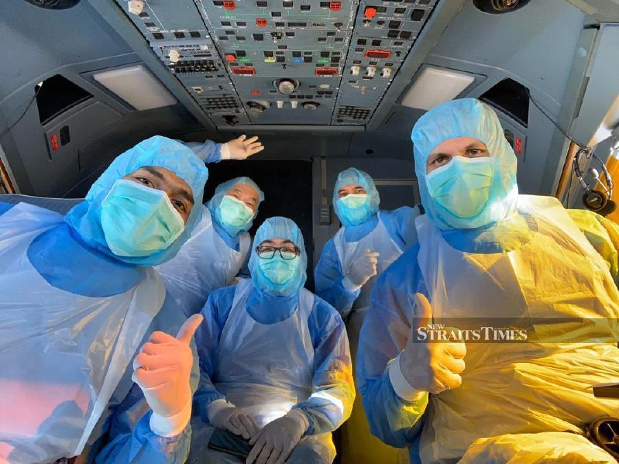 Afif (bìa trái) cùng phi hành đoàn bay đến Iran để sơ tán công dân về nước tránh dịch COVID-19.