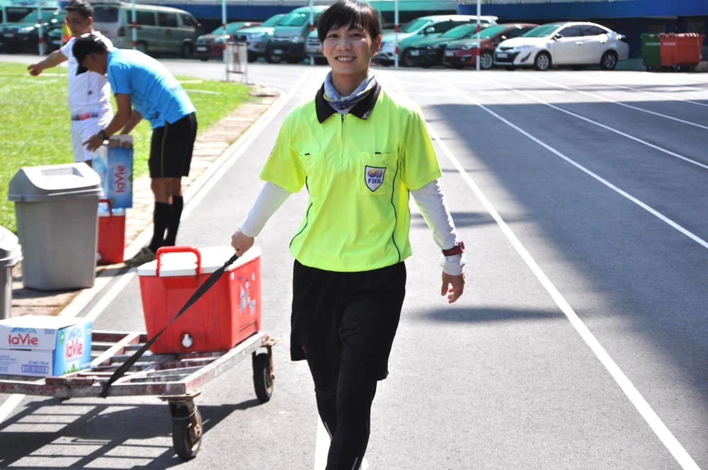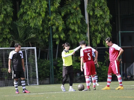 Cựu tuyển thủ quốc gia Thùy Trang làm trọng tài ở sân Tao Đàn trong cuộc chơi của các phóng viên thể thao TP.HCM dịp trước Tết Nguyên đán. Ảnh: CCT.