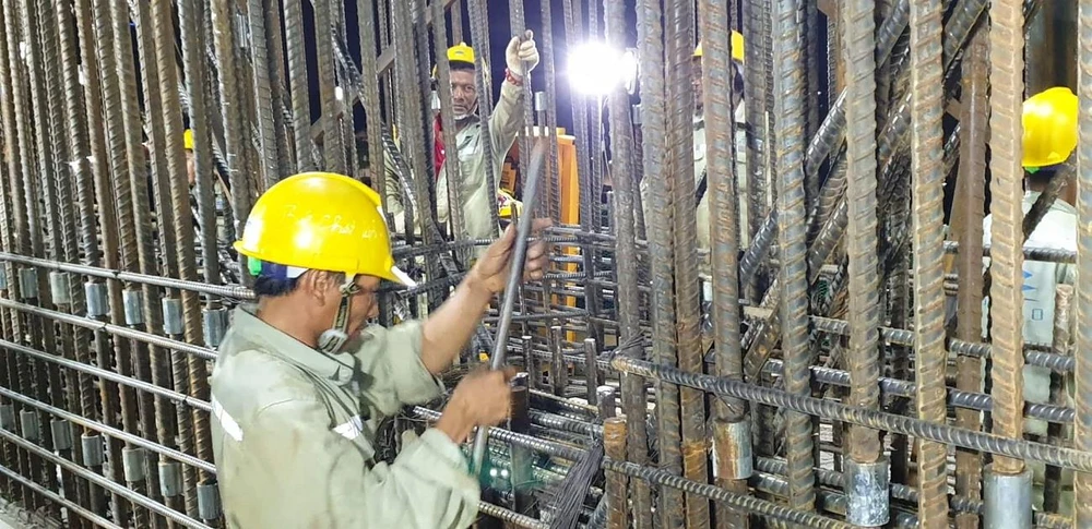 Các công nhân thức trắng đêm tại công trường để đảm bảo đúng tiến độ. Ảnh: ĐT.