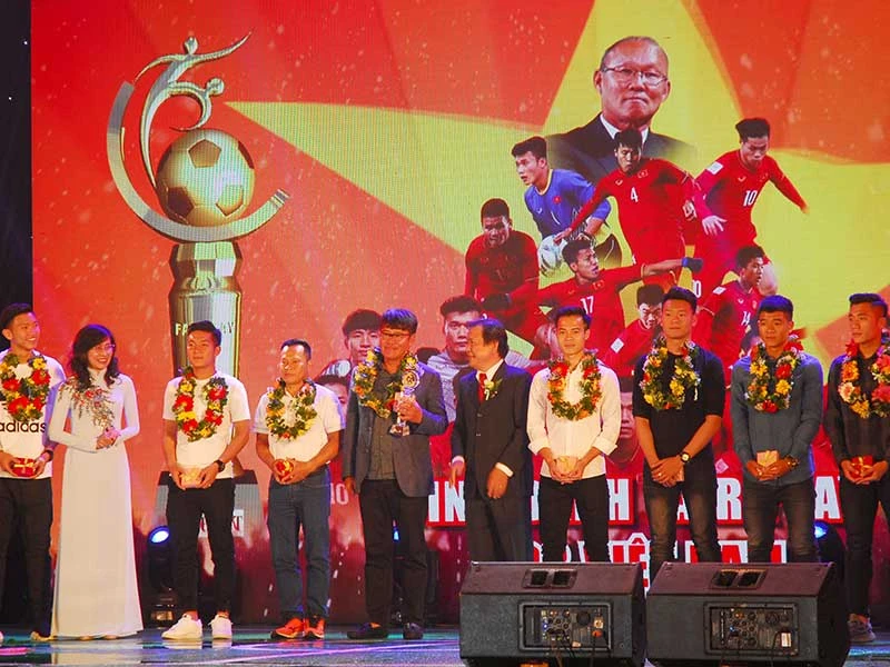 Đến thời điểm này vẫn có người chưa chuyển tiền thưởng cho cầu thủ dù đã hứa. Trong ảnh: Các cầu thủ U-23 Việt Nam được vinh danh trong ngày Gala Fair play 2017 do báo Pháp luật TP.HCM tổ chức. Ảnh: HTD
