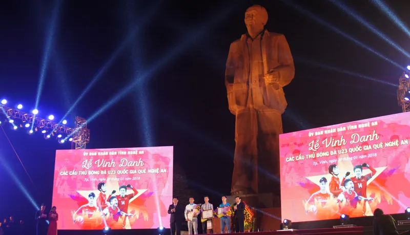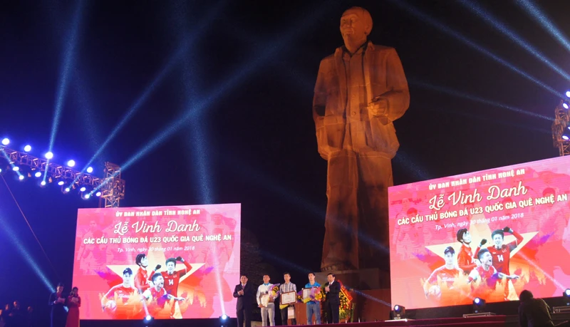 Bí thư Tỉnh ủy và Chủ tịch UBND tỉnh Nghệ An tặng hoa và bằng khen cho ba cầu thủ Công Phượng, Văn Đức, Xuân Mạnh dưới chân tượng đài Bác Hồ ở Quảng trường Hồ Chí Minh.