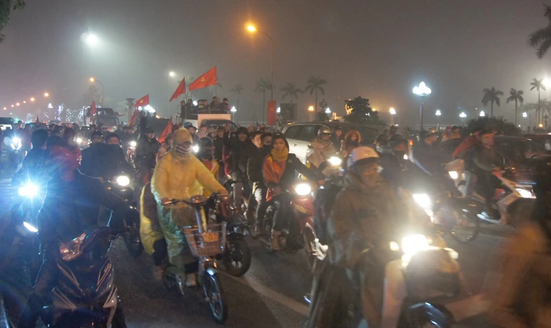 Người dân diễu hành trên đường Trường Thi (TP Vinh) đón các cầu thủ đêm 30-1.