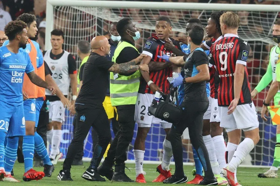 Trong pha hỗn chiến, Alvaro Gonzalez và Matteo Guendouzi của Marseille chạy về cuối sân để dằn mặt CĐV. Đội trưởng Nice sau đó đã cố gắng xoa dịu những CĐV đang tức giận.