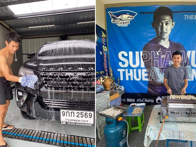 Mùa dịch, tuyển thủ Thái Lan Sarath Yooyen mở tiệm rửa xe, còn tuyển thủ Sufawut bán hàng ăn. Ảnh: SIAM SPORTS