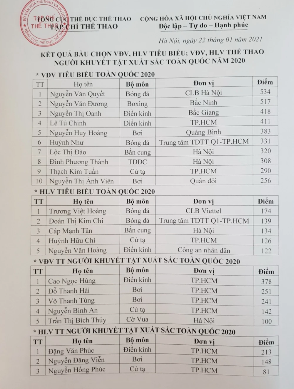 Kết quả bầu chọn VĐV, HLV tiêu biểu toàn quốc năm 2020 và VĐV, HLV người khuyết tật xuất sắc.