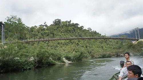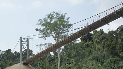 Chiếc cầu treo bắc qua Khe Khặng dẫn vào bản Cò Phạt, bản Búng, bản Cồn của tộc người Đan Lai sống trong vùng lõi Vườn Quốc gia Pù Mát (xã Môn Sơn, huyện miền núi Con Cuông, Nghệ An) vừa thi công xong. Ảnh: ĐẮC LAM