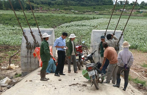 Muốn lên cầu, người dân phải men theo con đường mòn nhỏ hẹp, thấp trũng rồi đi tắt ngang qua đám rẫy liền kề mố cầu của một hộ dân. Tuy nhiên, gần một tháng nay, hộ dân này có nhu cầu xới đất trồng bắp nên đã dùng dây thép gai cùng nhiều vật dụng rào chặn đầu cầu ngay sát đất rẫy.