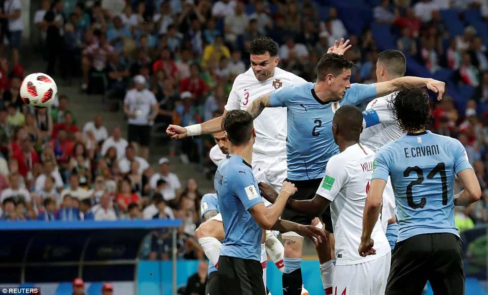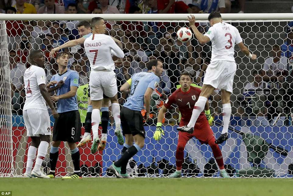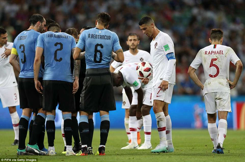 Cristiano Ronaldo chính là người đã có pha dứt điểm trúng đích đầu tiên cho Bồ Đào Nha nhưng không thành công. Đây là tình huống Ronaldo phàn nàn với trọng tài vì bị phạm lỗi ngay trước khi Cavani mở tỉ số cho Uruguay.