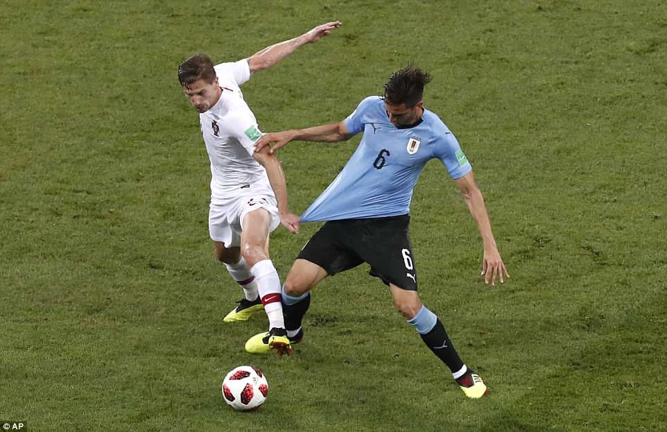 Adrien Silva của Bồ Đào Nha kéo áo Rodrigo Bentancur trong pha tranh chấp bóng ở hiệp 1.