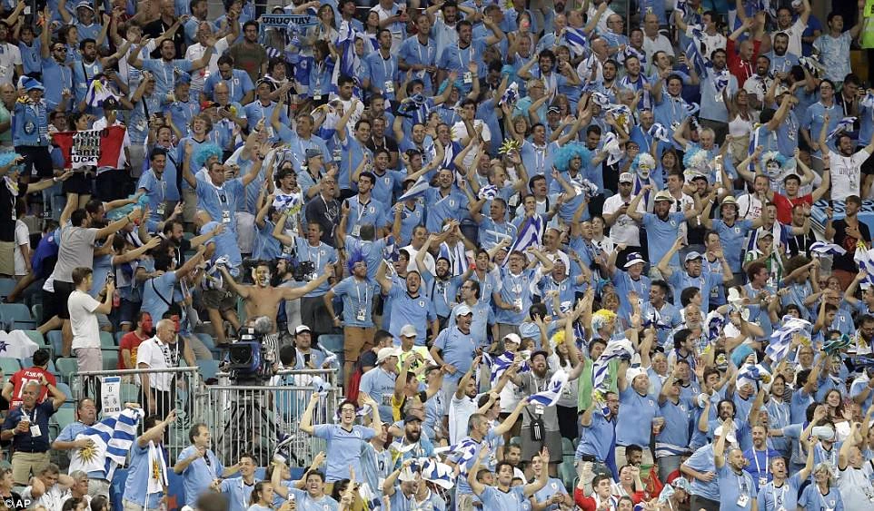 Hàng ngàn fan hâm mộ Uruguay có mặt trên khán đài sân vận động Olympic Fisht ở Sochi phấn khích với bàn thắng của Cavani.