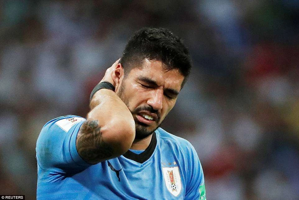 Phản ứng của Suarez sau khi bỏ lỡ thời cơ ghi bàn cho Uruguay. Suarez trận này thi đấu rất ma mãnh với nhiều pha nằm sân ăn vạ.