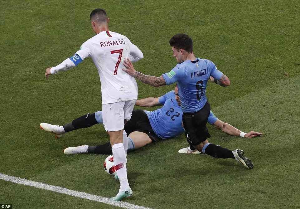 Martin Caceres của Uruguay (nằm) và Nahitan Nandez (phải) cố gắng ngăn Ronaldo đi bóng. Bồ Đào Nha sau đó bế tắc toàn tập...