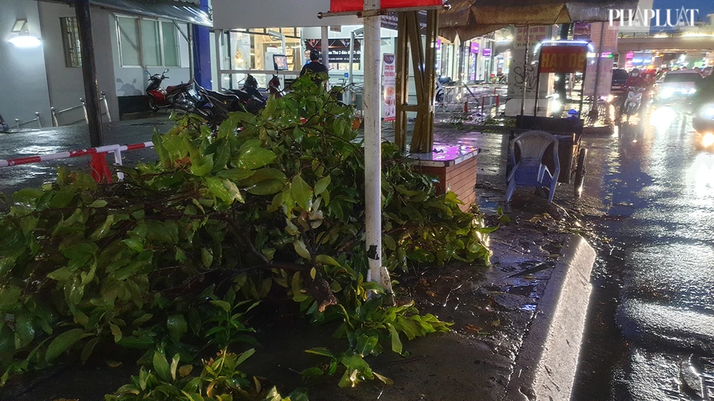 Trong khi đó, ở số nhà đối diện cũng thuộc phường 10 (quận Gò Vấp), một nhánh cây dầu ở độ cao khoảng 20 mét bất ngờ bị gãy, rớt xuống vỉa hè đường Quang Trung. May mắn, cành cây nhỏ không va trúng một ai.