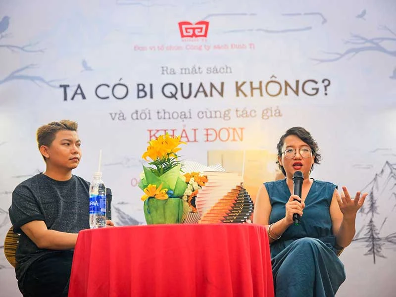 Cây bút Khải Đơn (phải) tại buổi ra mắt tập sách Ta có bi quan không? Ảnh: NGUYỄN TẬP