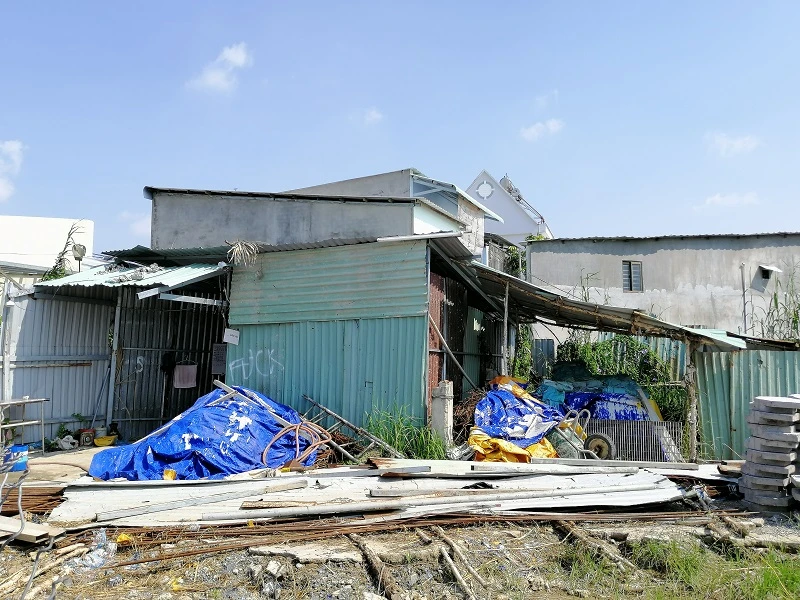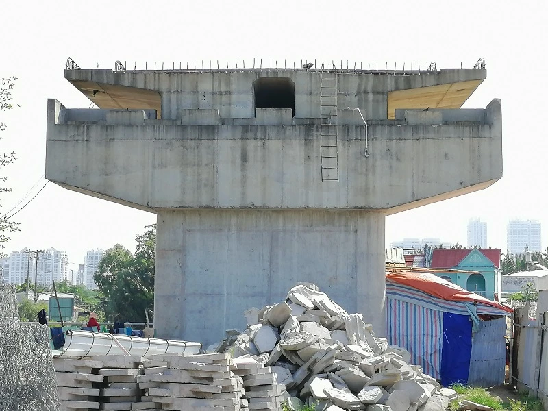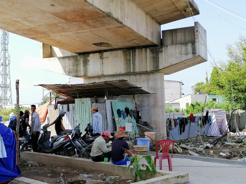 Dưới gầm cầu có nhiều ngôi nhà tạm bợ cho công nhân của dự án xây dựng khác ở.