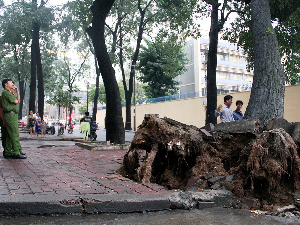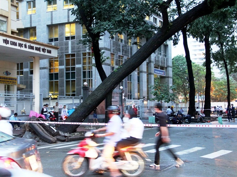 Tại hiện trường, cây cổ thụ cao hàng chục mét, đường kính gốc khoảng 1 m nghiêng một góc khoảng 60 độ, nằm gác sang một cây xanh khác và có thể đổ sập bất cứ lúc nào, rễ cây ít và khá nông.