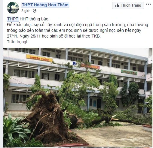 Chiều 26-11, trên trang fanpage của Trường THPT Hoàng Hoa Thám đã đăng tải thông báo với nội dung để khắc phục sự cố cây xanh và cột điện ngã trong sân trường, nhà trường thông báo đến toàn thể các em học sinh sẽ được nghỉ học đến hết ngày 27-11. Ngày 28-11 học sinh sẽ đi học lại theo thời khóa biểu.