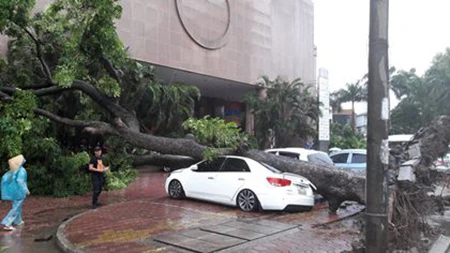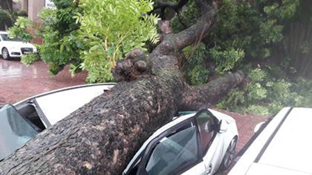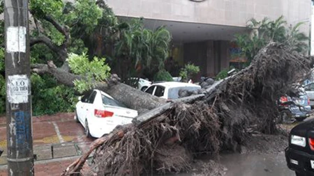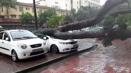 Theo các nhân chứng cho hay, vào khoảng 11 giờ 30 trưa nay (19-8), trước cổng tháp Hà Nội, thuộc đường Hai Bà Trưng (Hà Nội), một cây xà cừ có đường kính lớn đã bật gốc đổ vào một chiếc ô tô hiệu KIA Forte đang đỗ phía dưới, khiến chiếc ô tô này bị biến dạng do cây đổ đè lên nóc.