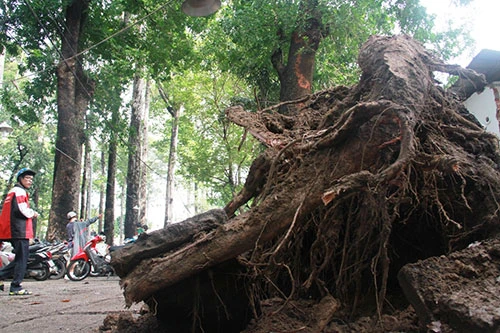 Theo nhiều người dân, nguyên nhân cây bị đổ là do mấy ngày mưa lớn làm kết cấu đất yếu, cạnh gốc cây lại có cống thoát nước nên đã làm rễ bị thối, không bám được.